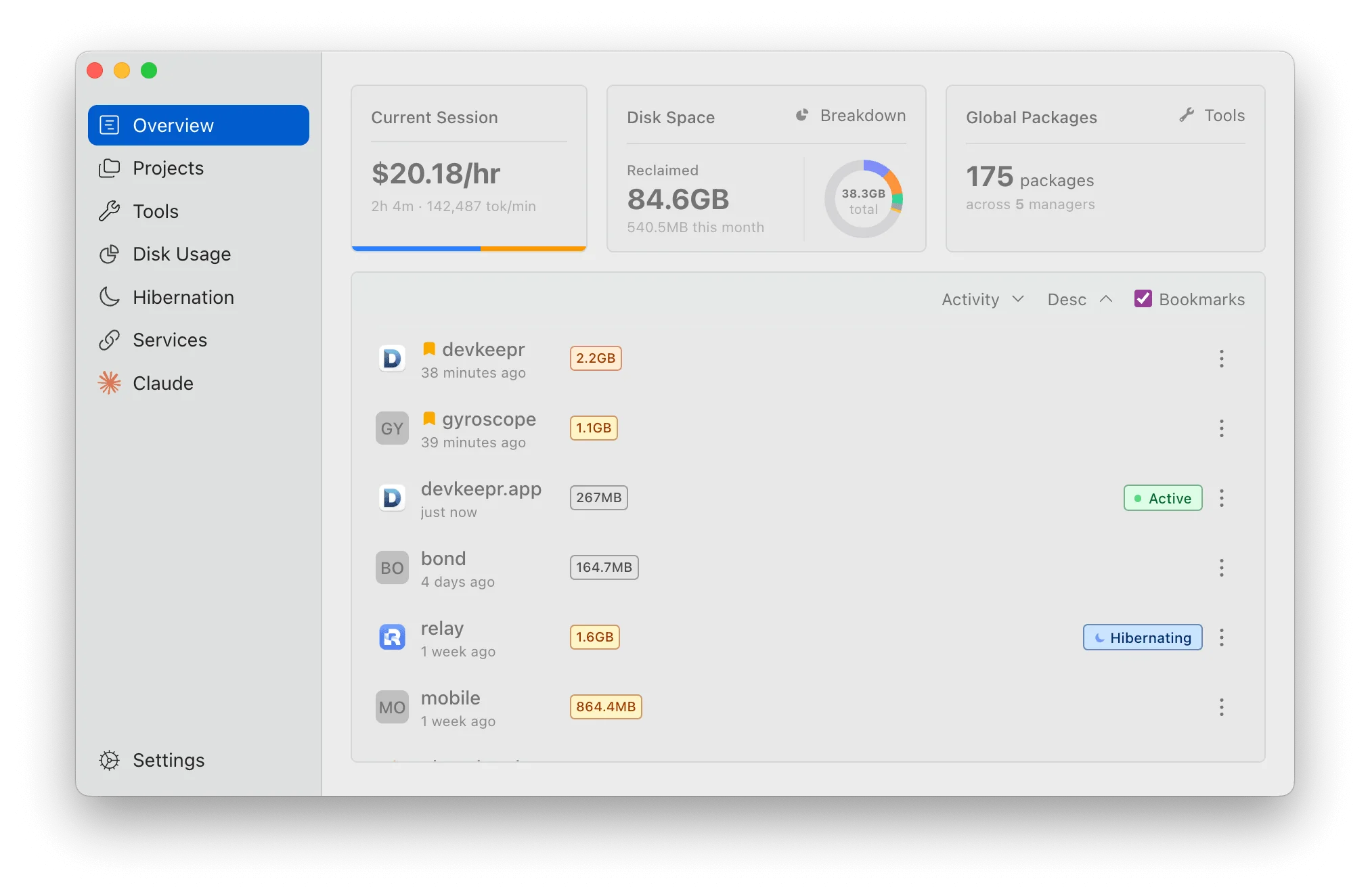 Hibernates idle projects, wakes them instantly, syncs branches, updates packages. All automatically.